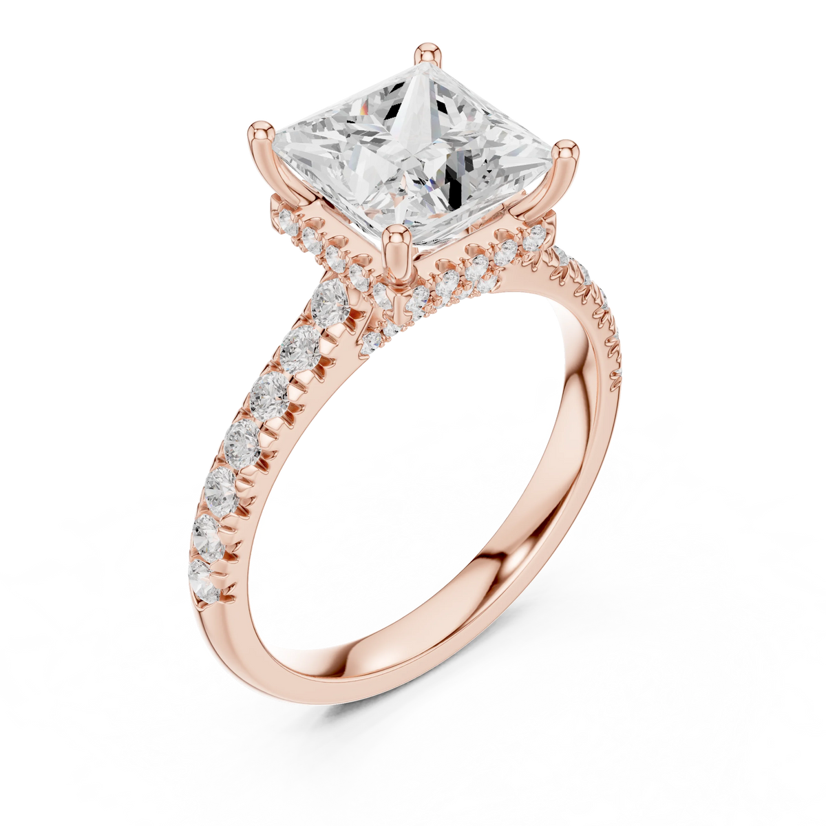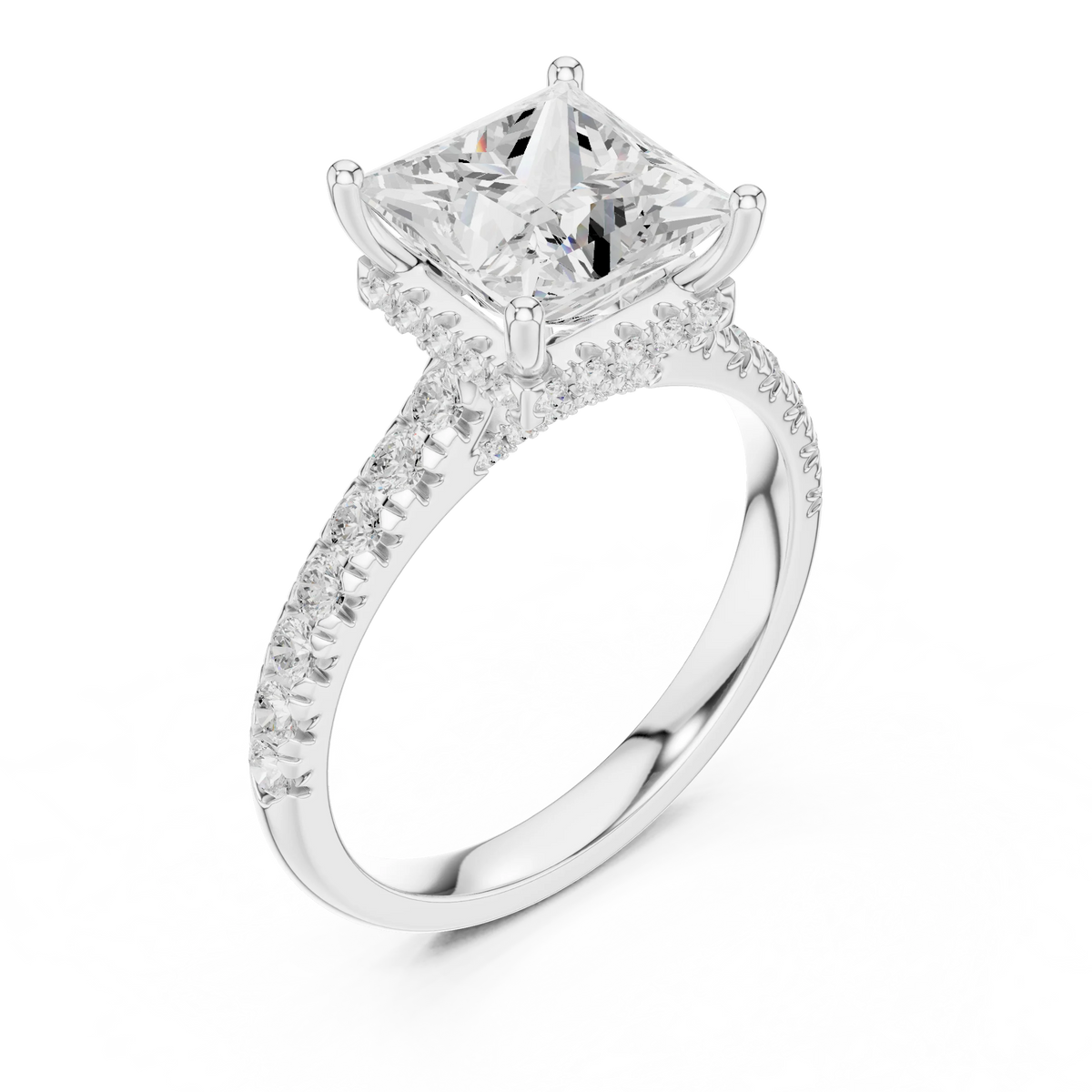 Princess Cut Diamond Hidden Halo Engagement Ring with Pave Band