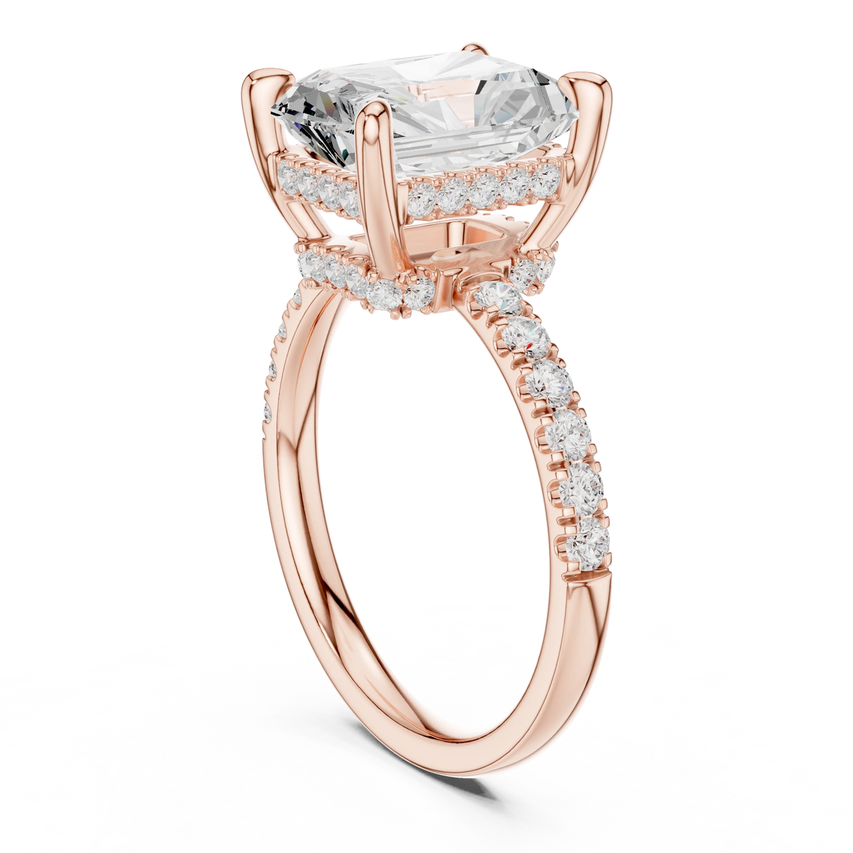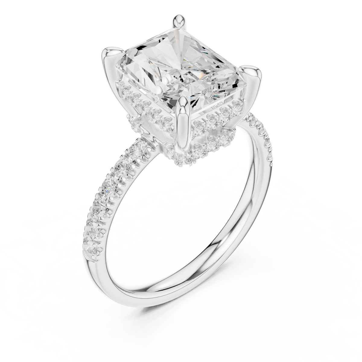Radiant Diamond Hidden Halo Engagement Ring with Pave Band